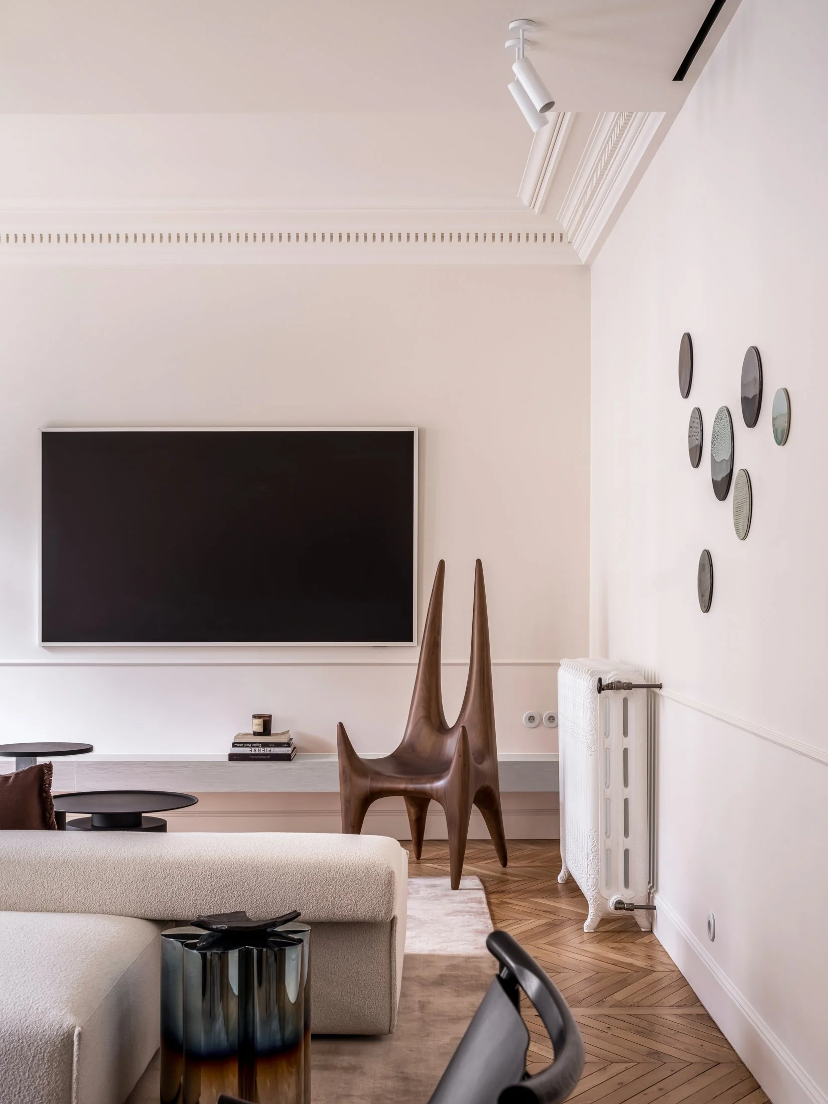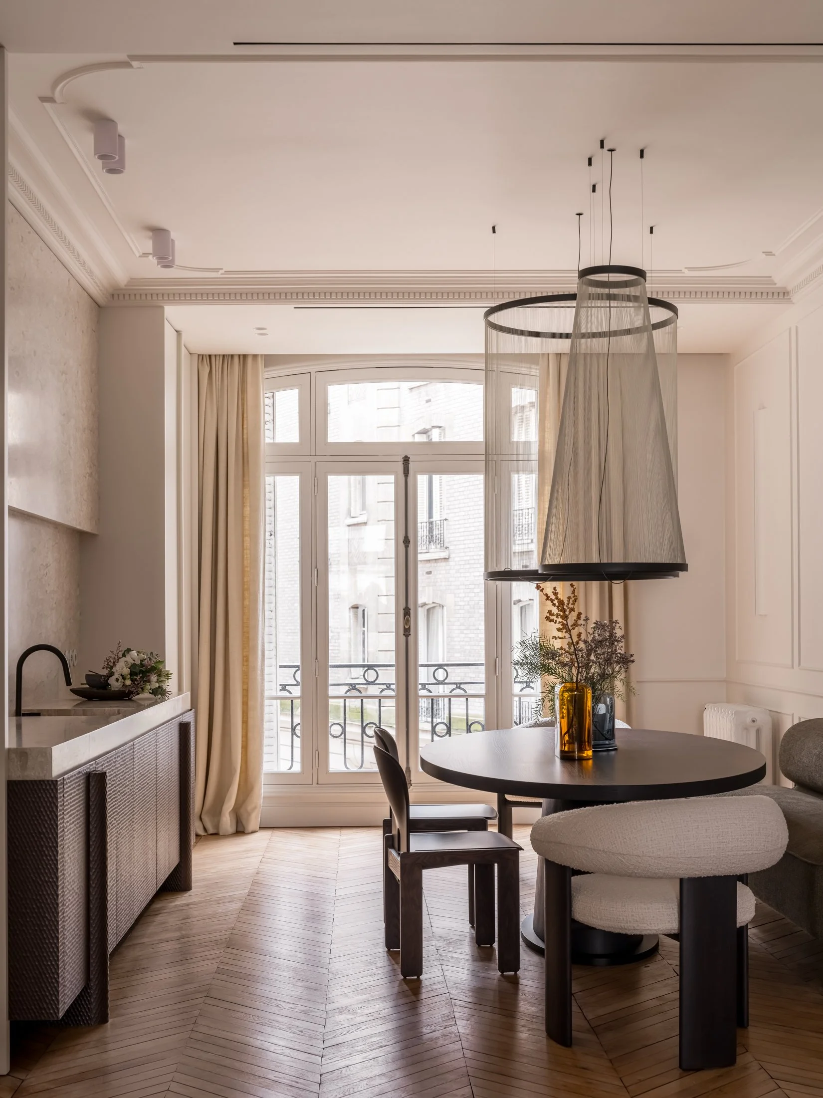 La lumière naturelle glisse sur les surfaces en staff, révélant la finesse des reliefs et la précision des alignements. Entre la rigueur du vocabulaire haussmannien et la douceur des formes contemporaines, un dialogue s’installe. Les matières dialoguent, les pleins répondent aux vides, et l’espace respire. Rien n’est démonstratif, tout est intentionnel. Une esthétique construite sur la justesse, où l’architecture devient décor.